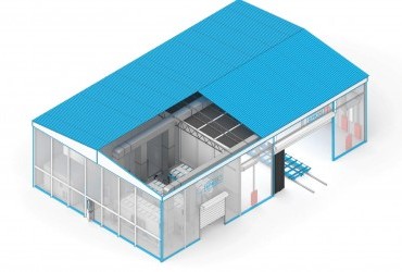 Конструкция дробеструйной камеры выполнена на металлокаркасе с навесом и включает резиновое покрытие для защиты стен от дроби. Оснащена двумя утепленными роллетными воротами размером 7000х5000 мм и двумя воротами размером 3000х3000 мм для обслуживания. В рабочей зоне установлены светильники со специальным укрепленным стеклом для защиты от дроби, обеспечивающие освещенность около 800 люкс — светодиодные модели. В системе также предусмотрены три вентиляционно-фильтровальные установки СПК-VFU-300 и электрический нагревательный агрегат СПК-VU-10. Управление осуществляется с помощью сенсорной панели.